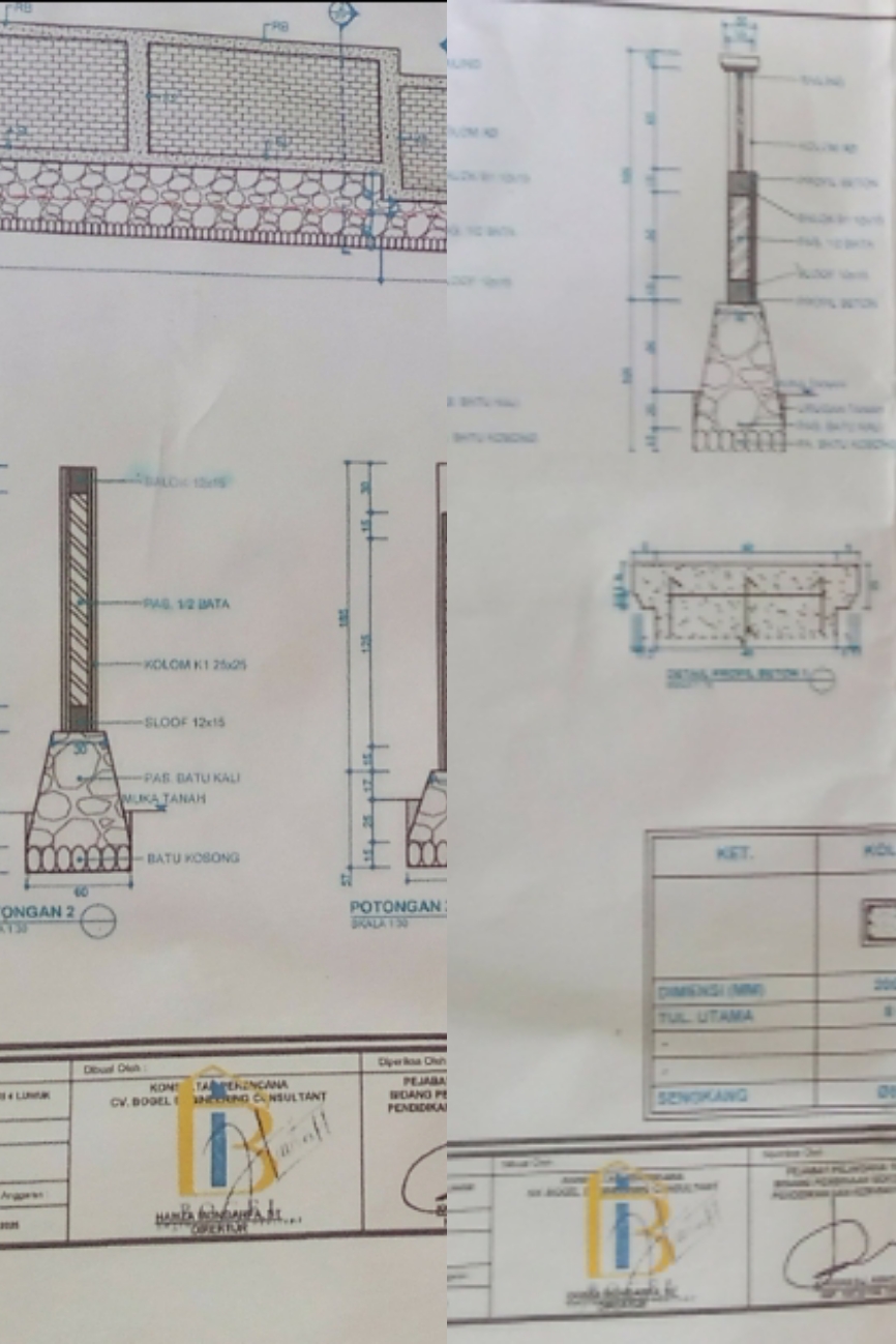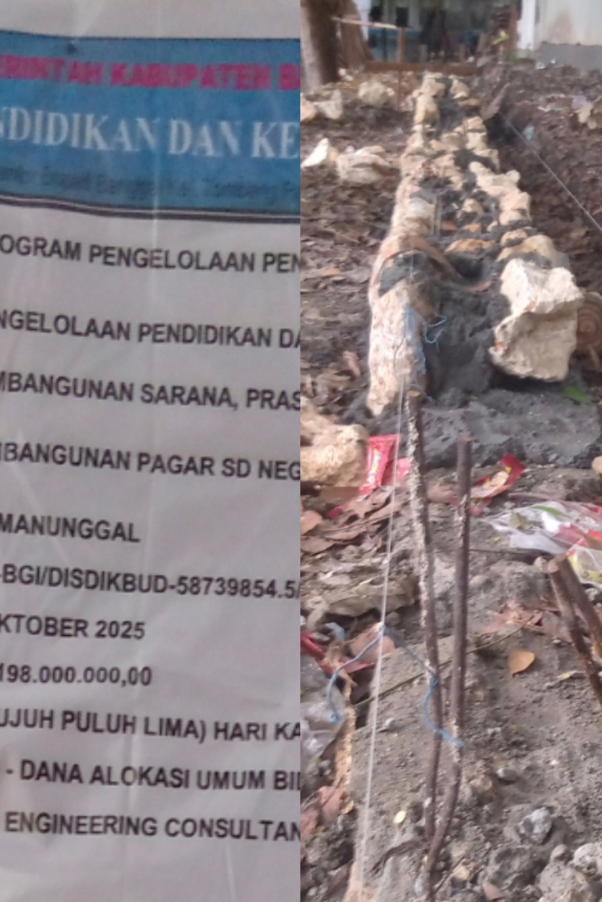 Proyek yang berasal dari Dinas Pendidikan dan Kebudayaan Kabupaten Banggai tahun 2025, melalui program Pengelolaan Pendidikan, dengan Sub Kegiatan Pembangunan Sarana, Prasarana dan Utilitas Sekolah yang dikerjakan oleh CV. Manunggal, dan nomor kontrak PK-BGI/Disdikbud-58739854.5/2025, dengan nilai kontrak Rp. 198.000.000. Dikerjakan tidak sesuai dengan gambar.