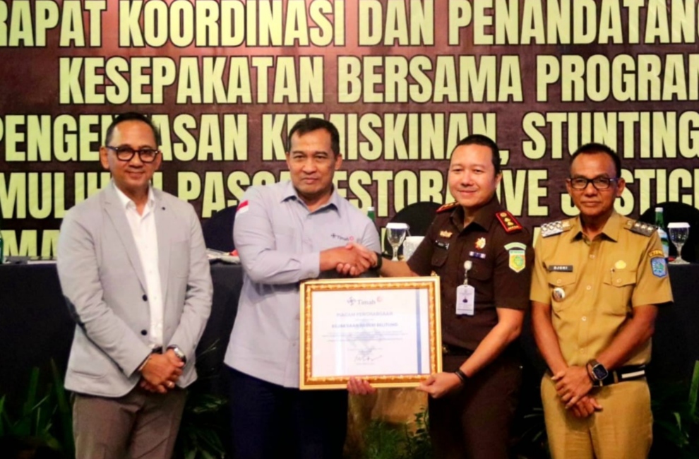 Penghargaan ini diserahkan oleh Direktur Utama PT TIMAH Tbk Restu Widiyantoro kepada Kepala Kejaksaan Negeri Belitung Bagus Nur Jakfar Adiputro yang turut disaksikan oleh Kepala Kejaksaan Tinggi Provinsi Kepulauan Bangka Belitung (Babel) Bapak Sila Haholongan dan Bupati Kabupaten Belitung Djoni Alamsyah dalam kegiatan ‘Rapat Koordinasi dan Penandatanganan Kesepakatan Bersama Program Pengentasan Kemiskinan, Stunting, dan Pemulihan Pascarestorative Justice serta Human Trafficking di Kabupaten Belitung’ yang berlangsung di Hotel Golden Tulip, Senin (29/12/2025).