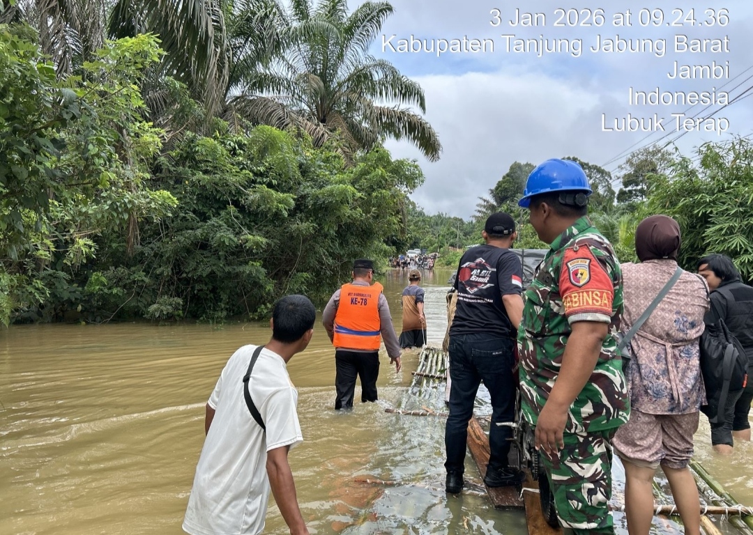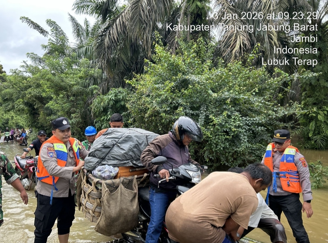 Kapolres Tanjung Jabung Barat AKBP AGUNG BASUKI, SIK., MM, melalui Kapolsek Merlung, AKP Agung Heru Wibowo, S.H., M.H., menyampaikan bahwa pengecekan dilakukan di beberapa lokasi strategis dan rawan genangan air, di antaranya Jalan Lintas Tengah Tebo–Merlung Desa Lubuk Terap, akses jalan menuju Merlung di Desa Tanjung Paku, serta Pasar Kalangan Desa Merlung, Kecamatan Merlung.