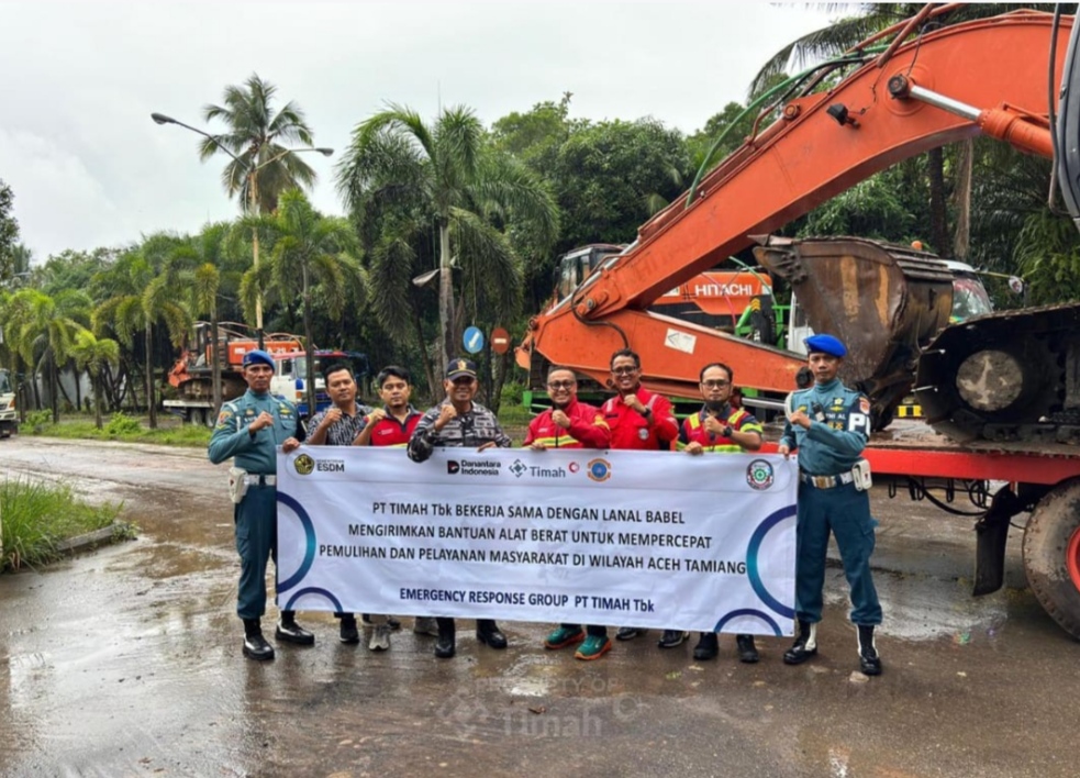 Cakrawalanational.news-Mentok Bangkabarat, PT TIMAH Tbk bekerja sama dengan Pangkalan TNI Angkatan Laut (Lanal) Bangka Belitung mengirimkan bantuan lima unit alat berat jenis excavator untuk mempercepat pemulihan dan pelayanan untuk masyarakat terdampak bencana banjir dan tanah longsoran di Aceh, Sumatera Utara, dan Sumatera Barat.