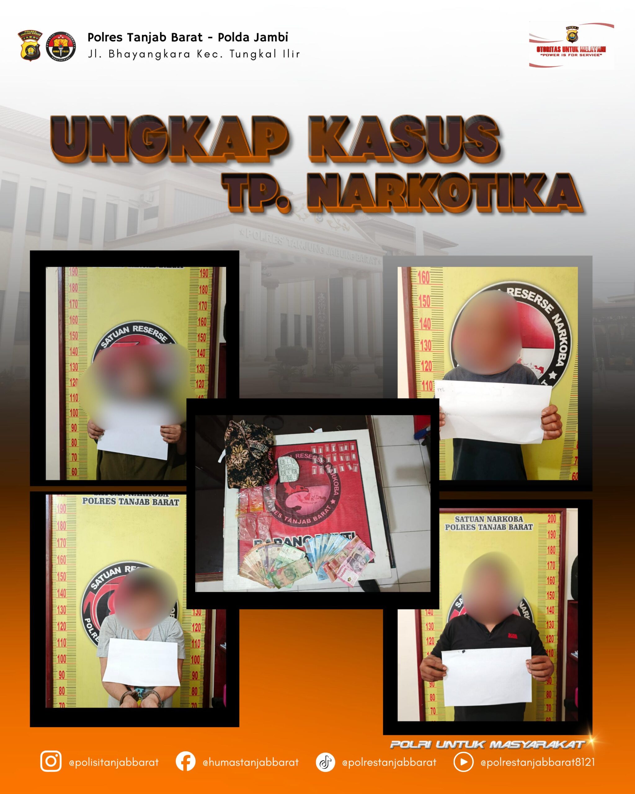 Keempat tersangka yang diamankan adalah SH, AI alias Atai, JM, dan IM, warga Kecamatan Tungkal Ilir, Kabupaten Tanjab Barat. Barang bukti yang disita antara lain 21 paket plastik klip berisi kristal bening seberat 6,51 gram bruto, uang tunai Rp1.800.000, dan 3 unit ponsel.