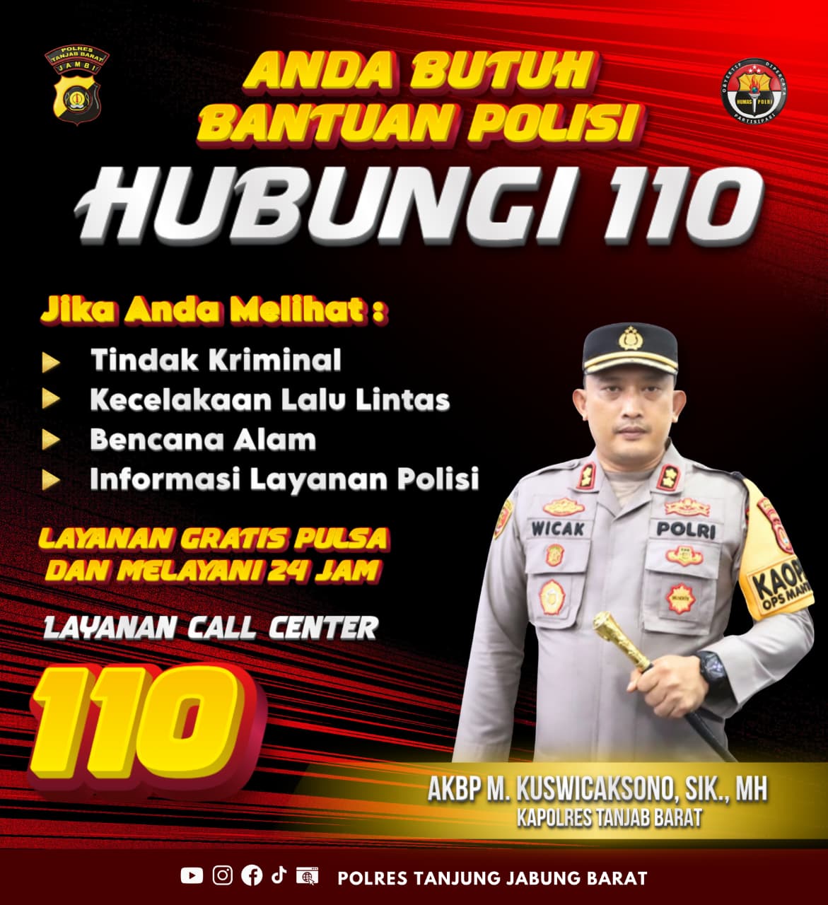 Kapolres Tanjung Jabung Barat AKBP M. Kuswicaksono, S.I.K., M.H., melalui Kasi Humas IPDA Ucen S. Kasih, menjelaskan bahwa layanan 110 dirancang untuk memangkas birokrasi pelaporan dan mempercepat respon petugas di lapangan.
