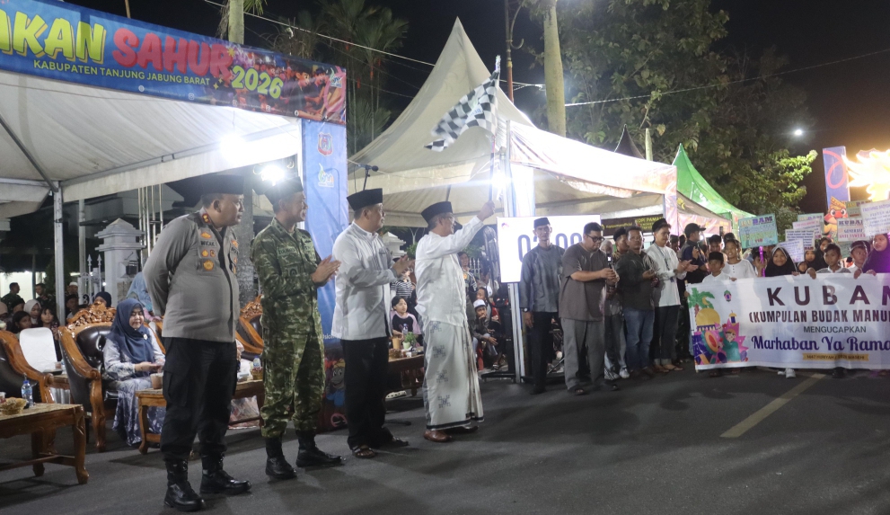 Cakrawalanational.news-Kuala Tungkal, Suasana semarak menyelimuti malam Ramadhan di Kabupaten Tanjung Jabung (Tanjab) Barat Provinsi Jambi, saat Festival Arakan Sahur 1447 H/2026 M resmi digelar pada Sabtu malam (7/3/2026).