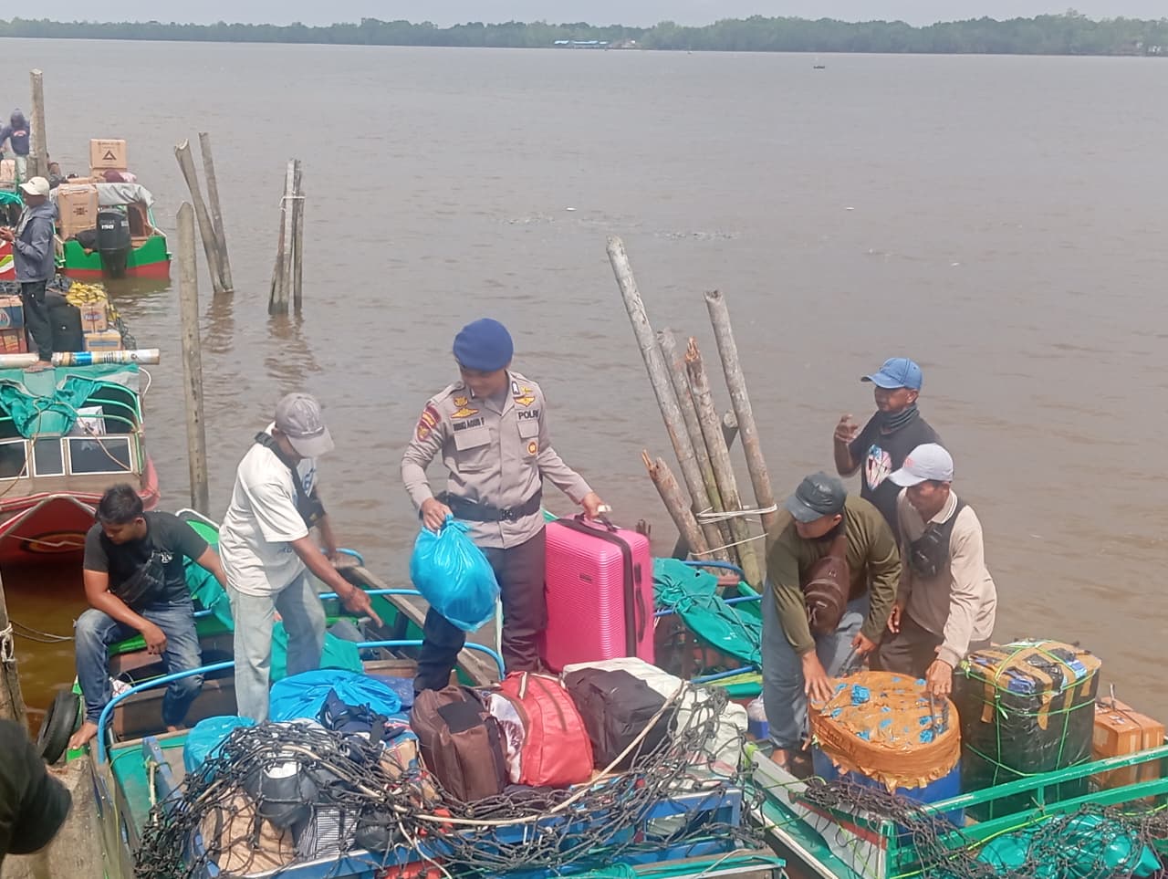 Pantauan di lokasi menunjukkan sejumlah personel kepolisian berdiri di bibir dermaga untuk menyambut kedatangan kapal. Mereka dengan sigap menggendong anak-anak, menuntun lansia, serta membantu ibu-ibu yang kesulitan membawa barang bawaan saat melintasi tangga kapal yang licin.