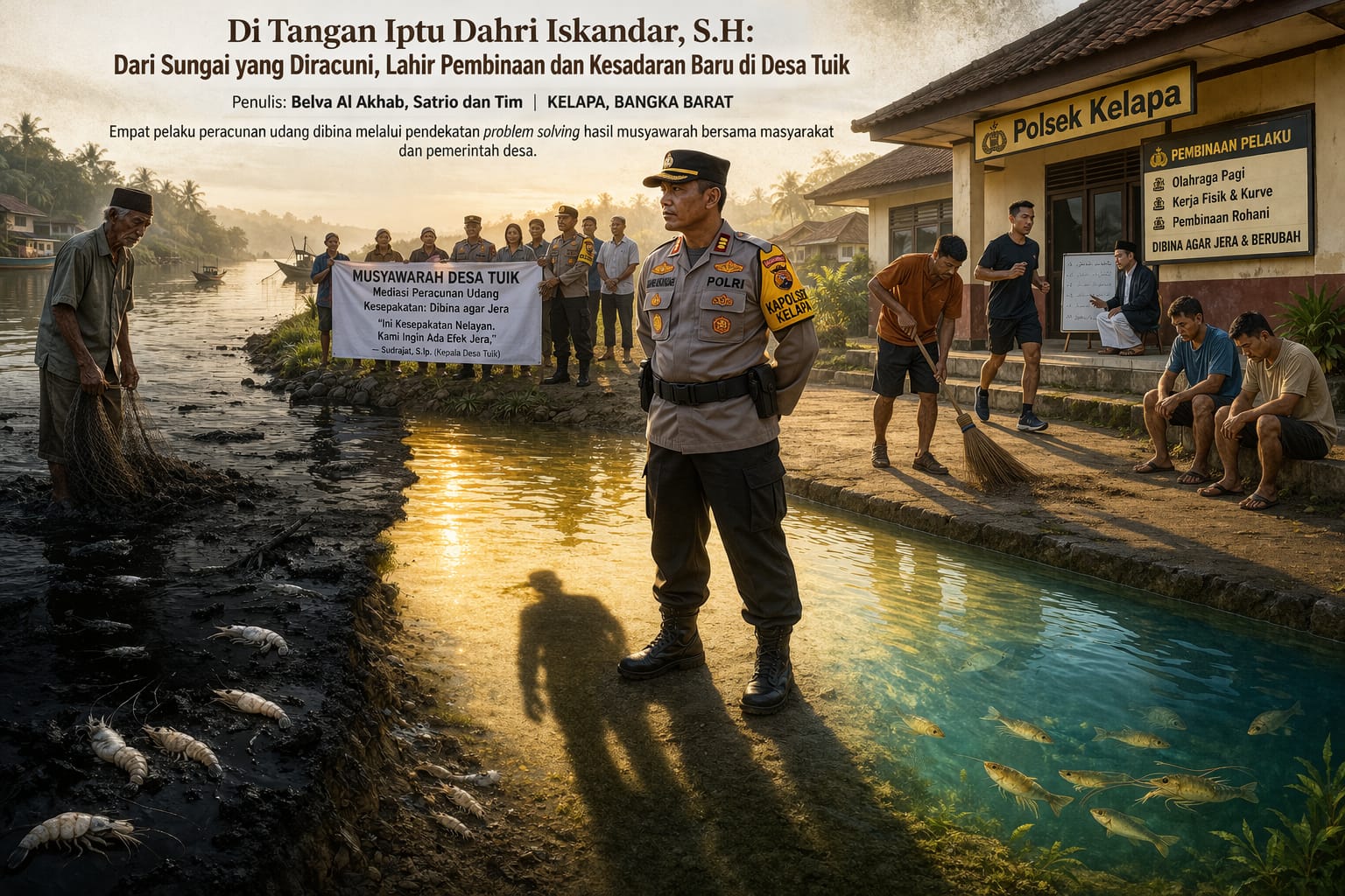 Cakrawalanational.news– Bangka Barat, Di tengah kegelisahan yang mengendap di sepanjang aliran sungai Desa Tuik, ketika udang-udang tak lagi kembali ke jaring nelayan dan air mulai kehilangan kejernihannya, hadir satu keputusan yang mengubah arah cerita. Kapolsek Kelapa, IPTU Dahri Iskandar, S.H., tidak memilih jalan yang lazim. Ia tidak sekadar menindak tetapi ia membina.