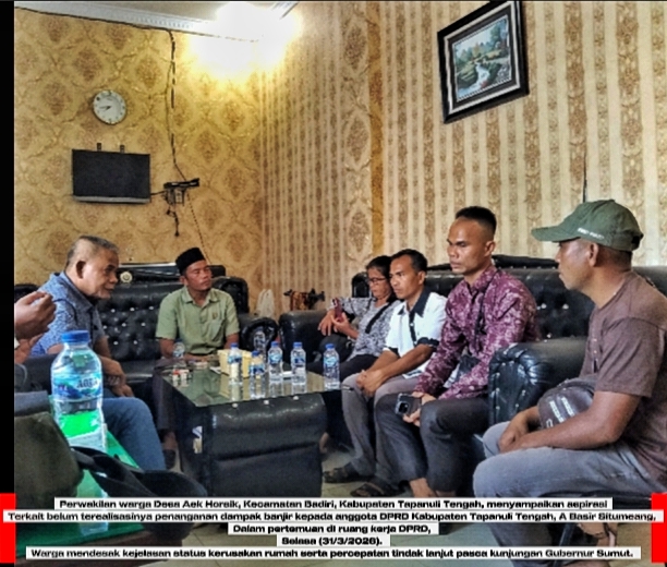 Aspirasi tersebut disampaikan oleh perwakilan 30 kepala keluarga (KK) dari Dusun III yang terdampak langsung bencana, dalam pertemuan bersama anggota DPRD Kabupaten Tapanuli Tengah, A Basir Situmeang, Selasa (31/3/2026) pagi, di ruang kerjanya.