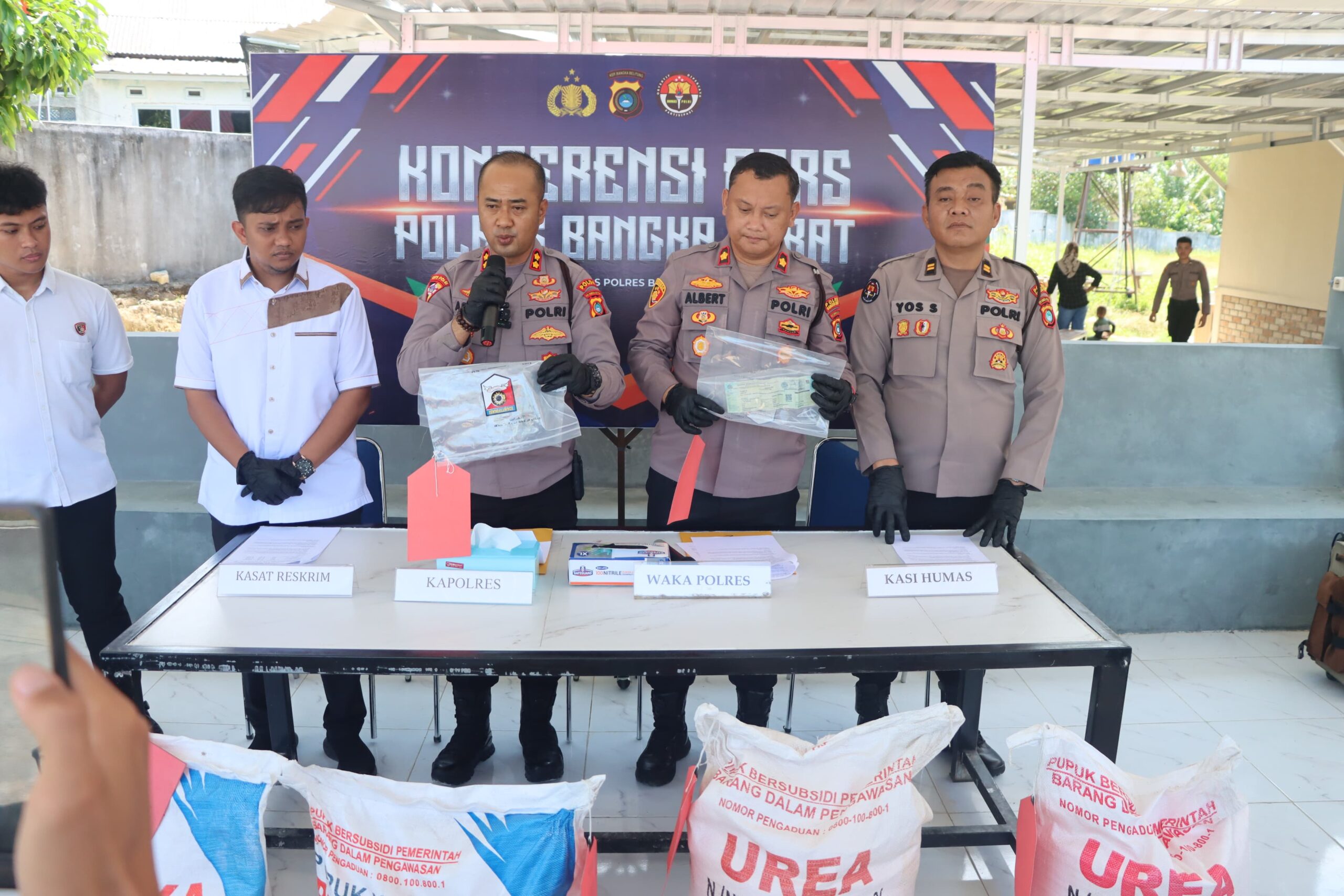 Cakrawalanational.news-Muntok, Bangkabarat, Polres Bangka Barat menggelar konferensi pers terkait pengungkapan kasus dugaan penyelundupan pupuk bersubsidi seberat 10 ton yang berhasil diamankan jajaran Satreskrim.