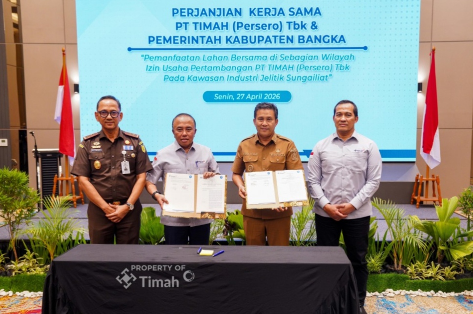 Cakrawalanational.news-Pangkalpinang, PT TIMAH (Persero) Tbk bersama Pemerintah Kabupaten Bangka menandatangani perjanjian kerja sama tentang Pemanfaatan Lahan Bersama di Sebagaian Wilayah Izin Usaha Pertambangan (IUP) PT TIMAH (Persero) Tbk pada Kawasan Industri Jelitik di Aston Emidary, Senin (27/4/2026).